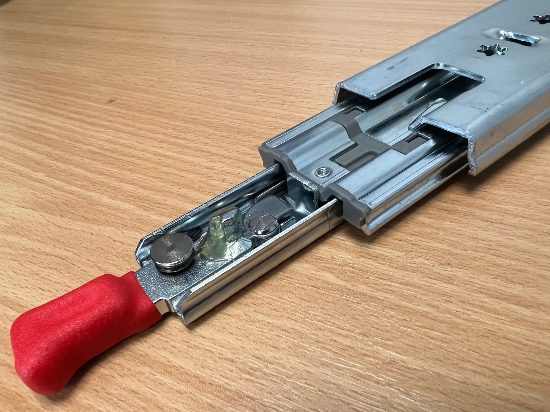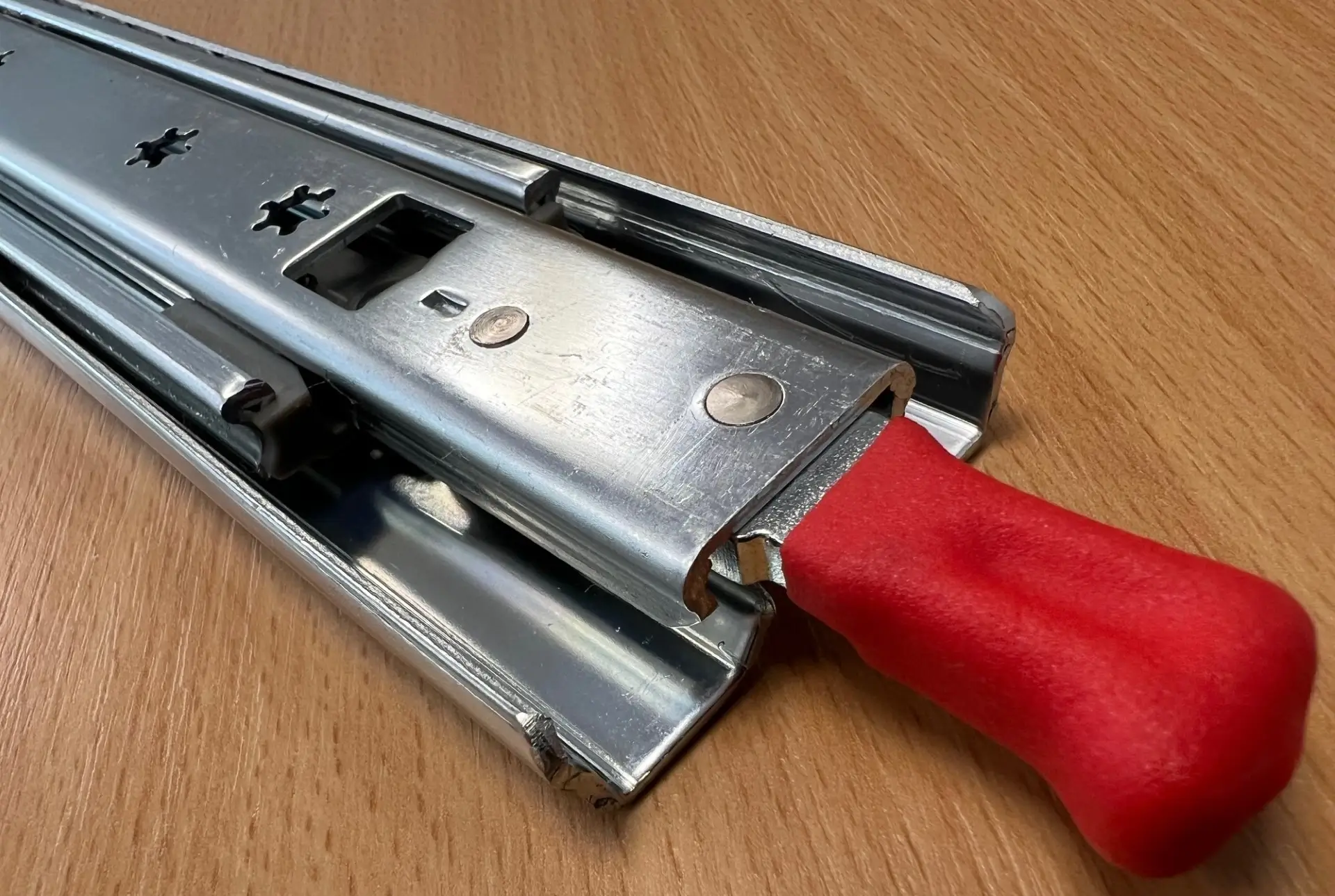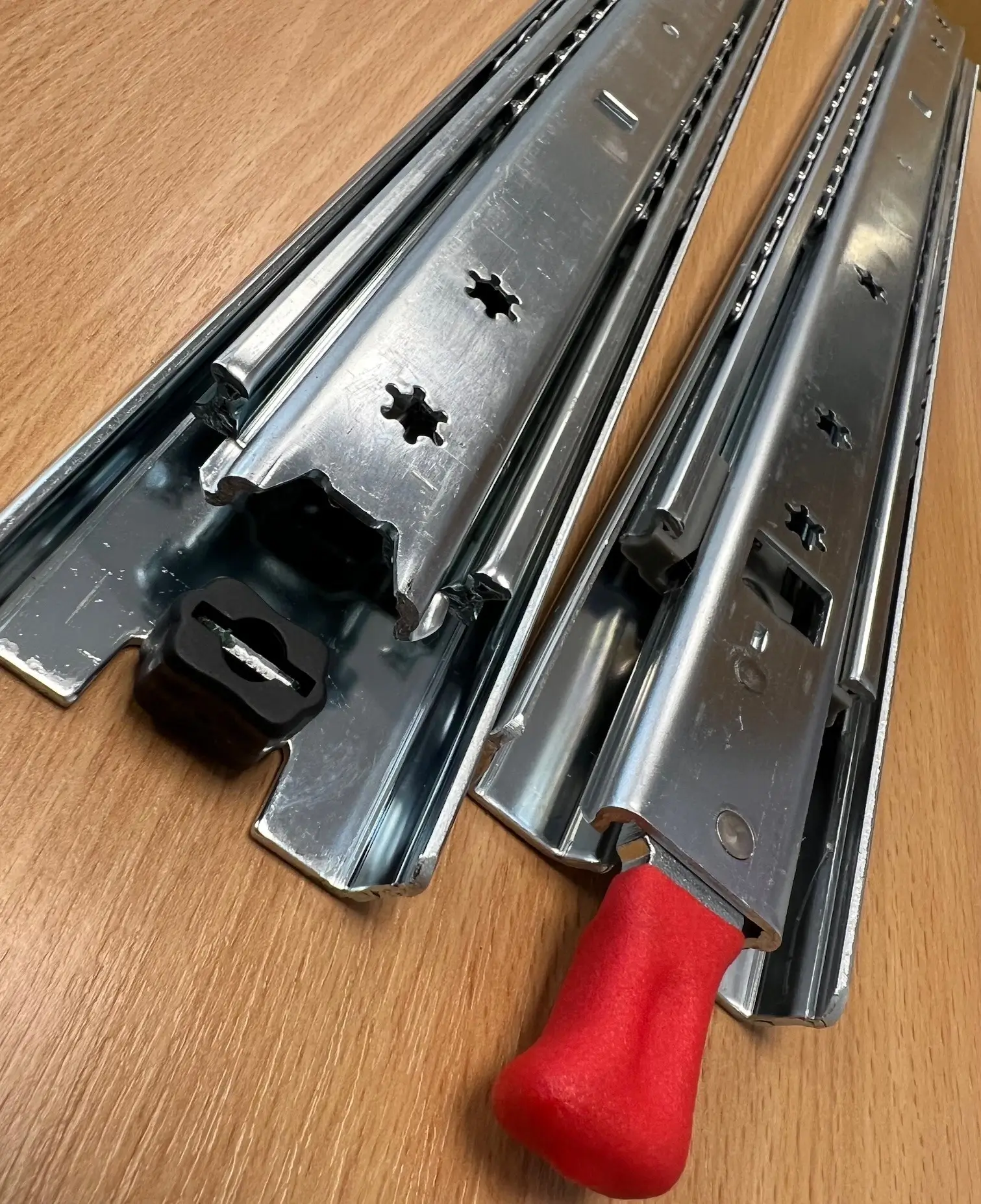The UTILITY RED FULLY LOCKING slide has been developed for the emergency and commercial vehicle market to suit light to medium drawers and racking. It has a bright red front lever handle which disconnects and connects the locking facility in the closed and fully extended positions. This is a lightweight hollow section slide with a maximum 100kg load capacity at full extension. The slides are easy to fit with the locking device being integrated into the beams. A pair of 450mm long slides have been bench tested to 50,000 cycles with a 100kg load applied. These are highly recommended for lighter duty, pick-up and utility truck drawers which need to be locked in the stowed and fully extended positions via a front activated latch. UTILITY Red telescopic slides are sold as Left & Right handed pairs, so order one unit if a pair is required